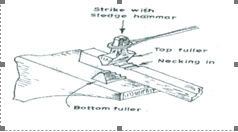 Fullering involves the use of fuller in pairs, the bottom fuller in the hardie hole and top one being held in the position is struck with the sledge. Where the drawing down is tapered, the fullering would begin with small indents, getting heavier towards the point and work would be finished with the hammer on the anvil.