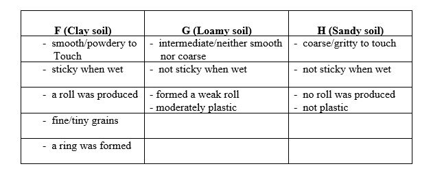 Take a sample each of specimens F, G, H and rub each between the thumb and forefinger. Put a sample of each of the specimens on your palm and add a little amount of water sufficient to wet it. Mix each sample with the water. Attempt producing a roll and then a ring.