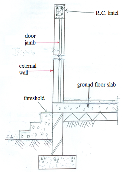 lintel and labelling of: (i) threshold steps; (ii) ground level; (iii) door jamb;(iv)reinforced concrete lintel over door opening; (v) external wall; and (vi) ground floor slab.