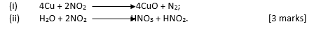 In part (b), majority of the candidates stated the property exhibited by nitrogen (IV) oxide in the reaction equation. In addition, quite a number of the candidates could not identify its action as a mixed anhydride.