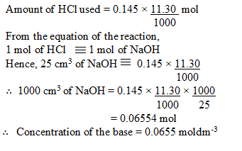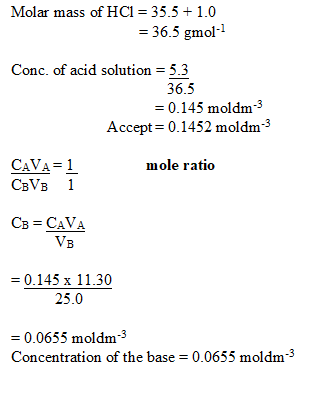 In part (a), majority of the candidates were able to calculate the concentration of the base in moldm-3. Also, the mass of NaCl formed during the reaction was calculated.