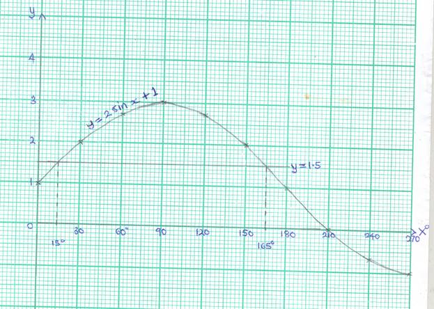 The x – coordinates of the points of intersection of the graph and the line y = 1.5 gave the required solution which was