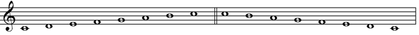 Eight successive notes, written on the stave, ascending or descending from the 1st to its 8th note (Octave) in the pattern of two whole steps, half step, three whole steps and a half step. Example, A - A, B - B, C - C e.t.c.