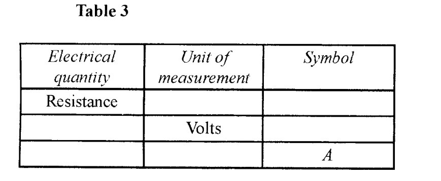 (a)Table 3 shows electrical quantities and their units of measurement and symbols.