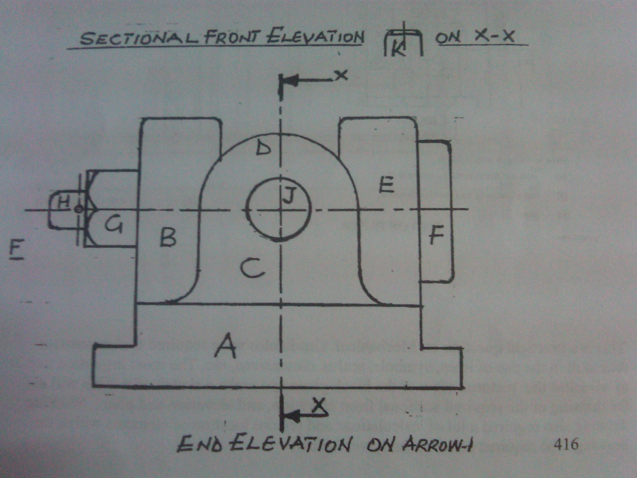 This is a practical question on Mechanical. Candidates were required to demonstrate their skill in the use of lines, symbols, scales, dimensions, etc. The most important step is to visualise the pictorial view of the block given and make a sketch of it. This will aid the drawing of the required sectional front elevation, end elevation and plan. Working drawing also required a lot of calculations and precise location of elements within the drawing. The required solutions are given below
