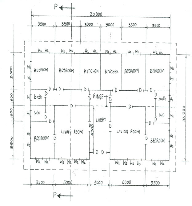 ROOF: 300 double pitch with 13 corrugated asbestos sheet; rafter – 100 x 50 at 1200 centres; purlins – 100 x 50 at 1000 centres; kingpost and strut – 100 x 50; wall plate – 100 x 75; tie beam – 100 x 50; ceiling joist – 50 x 50 at 1200 centres; floor to ceiling height 3150.