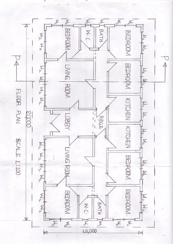 (4) The sketch below shows the floor plan of a twin three bedroom bungalow in the line diagram. Study the given specifications and answer the questions that follow: