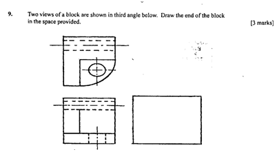 Candidates were expected to use projection lines to draw the outlines and show the hidden details. The solution is given below.