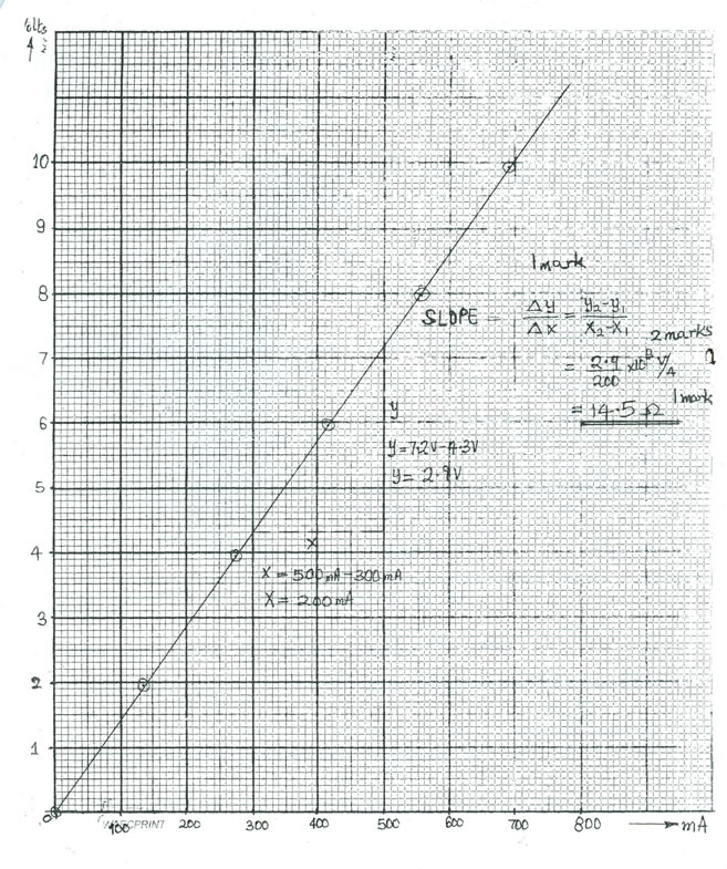- (j)Plot a graph of voltage (V) on the vertical axis against current (A) on the horizontal axis.