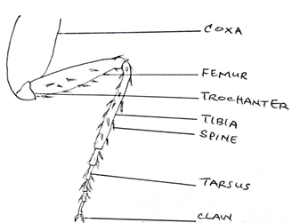 (e) Remove carefully one of the legs on the right side of the metathorax of specimen P. Make a drawing, 6 cm to 8 cm long of the removed leg and label fully. [8 marks]