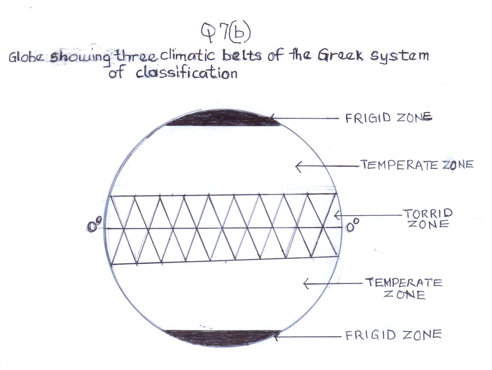 The question was a bit popular among the candidates and the performance was well above average. Most of those who answered the question were able to correctly define climate but were unable to locate the three climatic belts of the Greek System on the globe. It is illustrated thus: