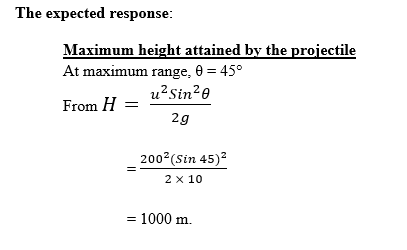 A missile is projected so as to attain its maximum range. Calculate the maximum height attained if the initial velocity of projection is 200m s-1. [g = 10m s-2]