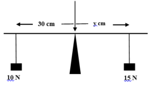 (ii) A rod of negligible mass is balanced horizontally by two weights 10 N and 15 N placed 30 cm and y cm respectively from a pivot. Calculate the value of y
