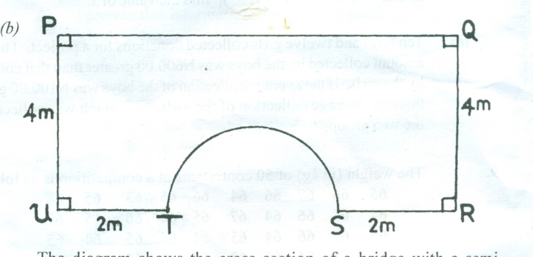 The diagram shows the cross section of a bridge with a semi circular hollow in the middle. If the perimeter of the cross section is 34 m, calculate the: