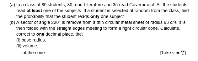 The Chief Examiner reported that part(a) of this question was well attempted by most candidates. While in part(b), a good number of candidates were not able to solve satisfactorily because of the use of wrong formula.