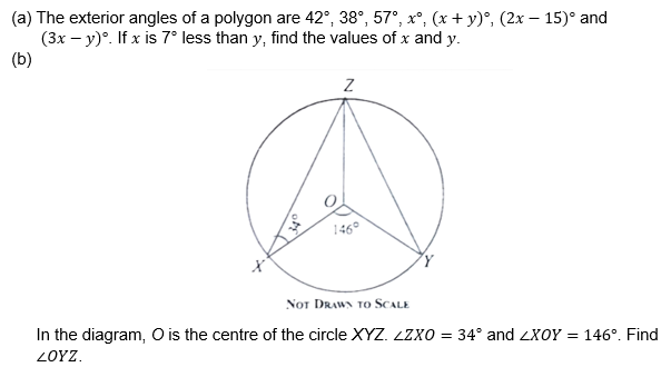 In part (a) (i), they were expected to obtain a relation for the second sentence as . Equate the sum of the exterior angles to 360 as shown: