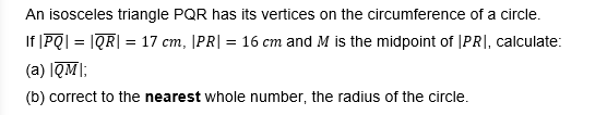 The Chief Examiner reported that this question was unpopular among candidates’. A good percentage of candidates that attempted it could not deduce the properties of an isosceles triangle correctly.