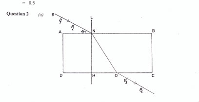 (This question, based on refraction of light through a rectangular glass prism is not popular among the candidates. Some candidates that attempted it had problems with their traces. Some did not attach traces. Those that attached traces have wrong traces or their traces do not have pin mark.