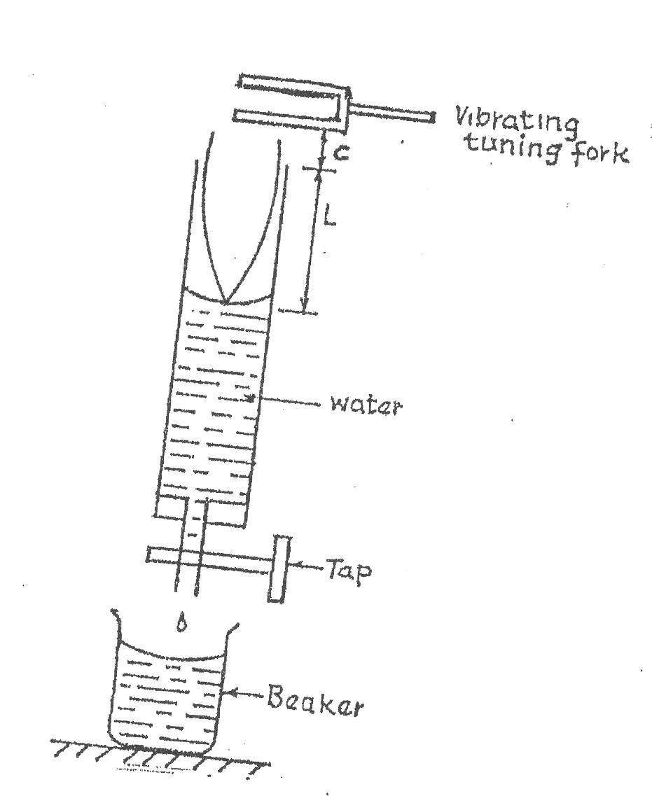 The experimental set-up illustrated above consists of a resonance tube filled with water and a vibrating tuning fork placed closed to the open end of the tube. When the top is opened and