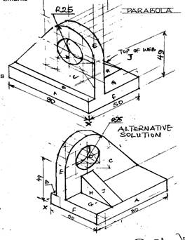 the starting point.  Note that, except for the circular parts which must be drawn in elliptical form., all other parts are either perpendicular or 30o to the horizontal.  The required solution is shown below: