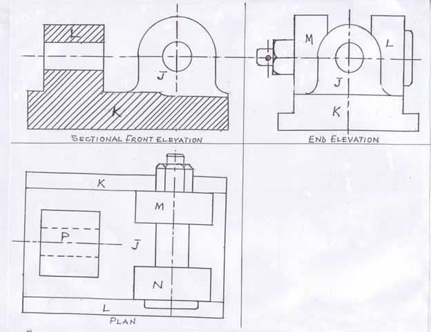 The figure below shows two views of a block.  Draw in first angle projection the: