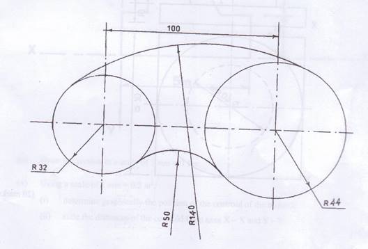 - draw the horizontal centre line and locate centres O1 and O2 100 apart;