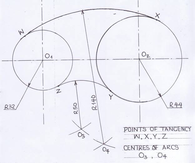 - locate and indicate centre of lower arc (R82, R94)and draw the arc R50;