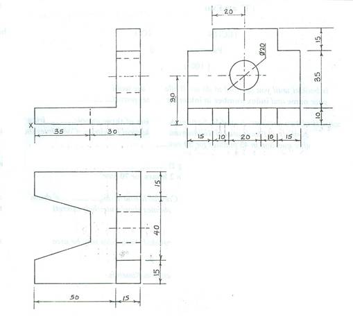 The figure above shows the views of a block in first angle projection. Make a freehand pictorial sketch of the block making X the lowest point.